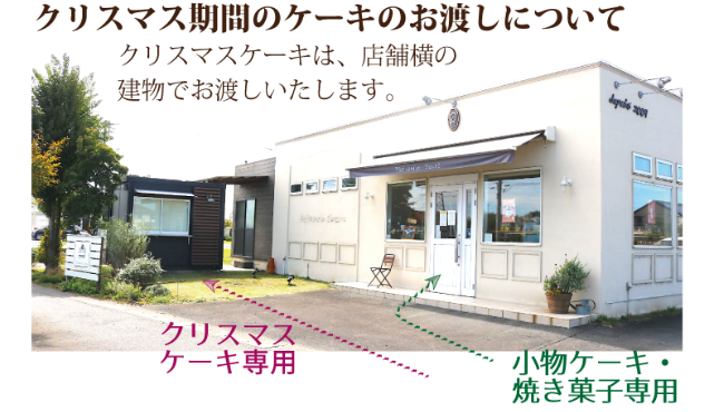 12月24、25日分のクリスマスケーキは、店舗脇の建物でお渡しいたします。その他のケーキや焼き菓子をご購入の方は、店舗でのご精算となりますので、ご理解のほどよろしくお願い申し上げます。